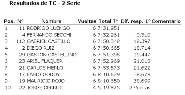 El piloto de VW pudo faltando una vuelta y media para el final superar al del Clio pero lamentablemente la competencia se definió en la técnica, ya que los Gol de Girala y Emmanuel Cáceres presentaron anomalías en los ackermann, entonces la victoria quedó en manos de Molé, seguido por Gustavo Santibañez y Pablo Malizia.