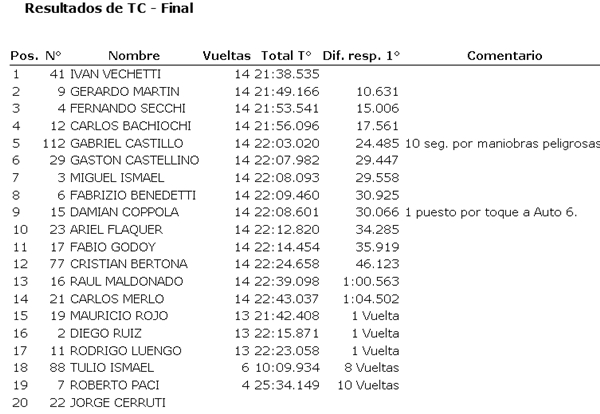 Sin embargo quedaba mucho por delante, algo que no detuvo su marcha y así lograr un triunfo que se le había negado en la fecha inicial de la temporada. Gerardo Martín (Dogde) llegó al segundo lugar luego de que Gabriel Castillo (Chevrolet) tocara el Ford de Fernando Secchi y se salieran de pista en la “3”. El del Falcon, completó el podio.