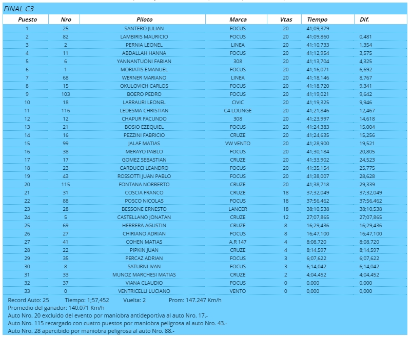 Julián Santero ganó su primera prueba final en Turismo Nacional Clase 3 y llevó al equipo GC Competición a lo más alto de la divisional por primera vez desde su debut, ocurrido en el año 2008. El mendocino se impuso a Mauricio Lambiris y a Leonel Pernia, quienes completaron el podio.