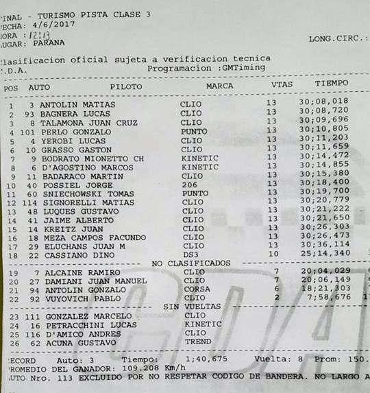 La Clase 3 desarrolló una atractiva final en el autódromo de Paraná, con la victoria de Matías Antolín, con Renault Clio.