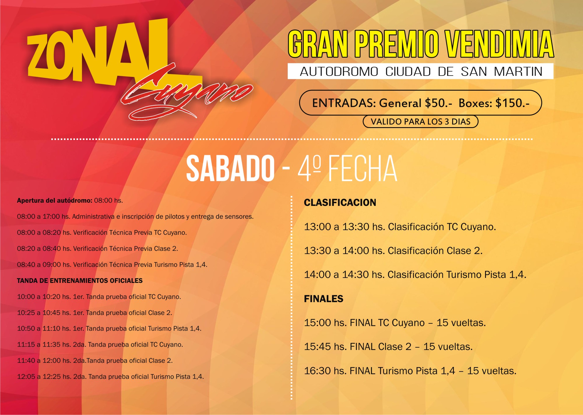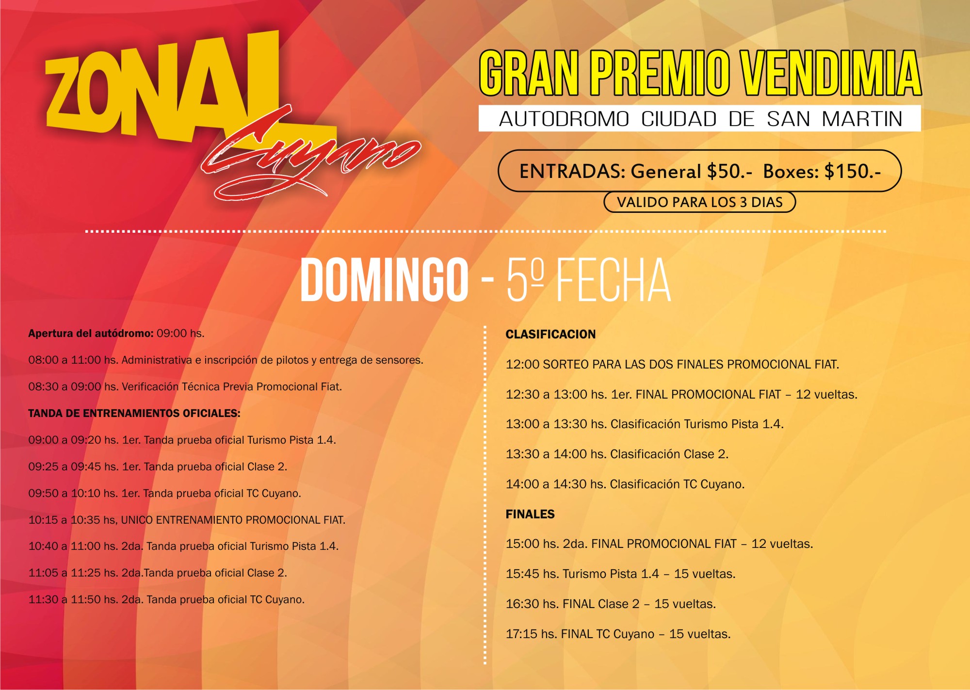La 5º fecha del Zonal Cuyano y 67º GP se realizará el sábado con las categorías Turismo Pista 1.4, Clase 2 y TC Cuyano. Habrán dos entrenamientos, una clasificación una final.