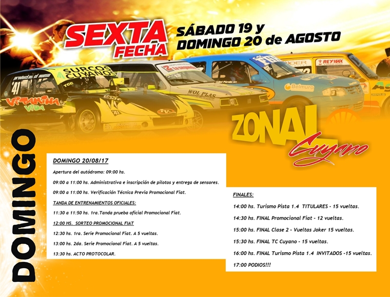 Para esta cita no habrán pruebas comunitarias el día viernes por lo que las dos jornadas que nos esperan serán extensas ya que el sábado habrá series de TP 1.4, Clase 2 y TC Cuyano, mientras que el domingo se disputarán las series de la Promocional por la mañana y en la tarde todas las finales.