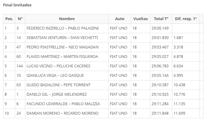 La competitiva especialidad disputó dos finales, una para titulares y otra para invitado, y en ambas el auto inalcanzable fue el mismo, el que manejó Federico Inzirillo y que atiende la familia Paladini. El desarrollo de cada una de las competencias fue similar y salvo el auto ganador cambiaron algunos actores que intentaron correrlo pero sin lograr, ni siquiera, buscar un sobrepaso.