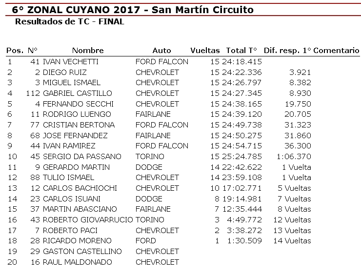 Damián Moreno fue el dueño de la Promocional Fiat y Gustavo Santibáñez ganó la carrera especial de la Clase 2 con “Vuelta Joker”. El Turismo Carretera Cuyano quedó para Iván Vechetti, mientras que Federico Inzirillo ganó la carrera de titulares del Turismo Pista 1.4 y su invitado Pablo Paladini no desentonó y ganó la final de invitados.