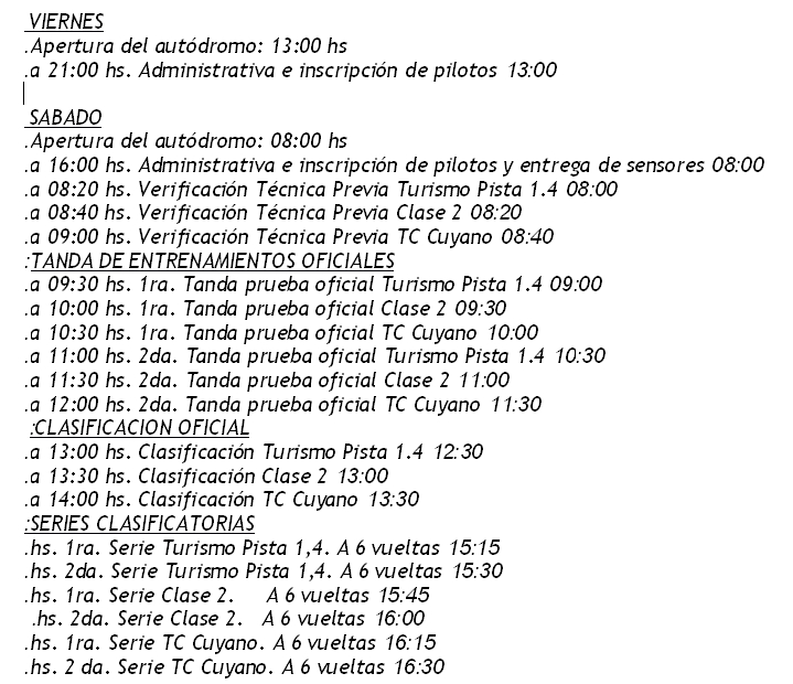 Horarios para la fecha apertura del Zonal Cuyano en San Martín 23/03/2018 / Zonal Cuyano Los equipos comenzaron a instalarse en el Autódromo de San Martín, donde mañana se inicia una buena temporada de automovilismo de pista en la provincia de Mendoza. CLIMA HORARIOS