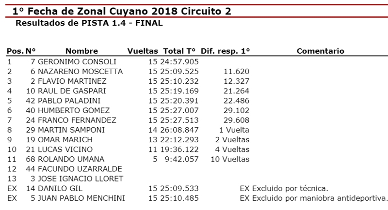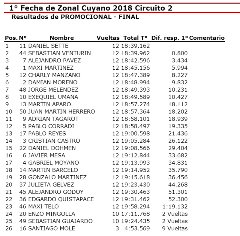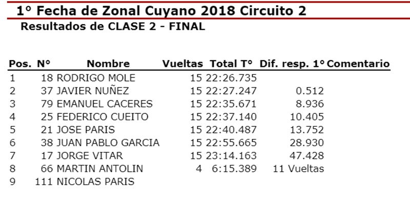 | Clase 2 | TC Cuyano | T. Pista | Promocional |
