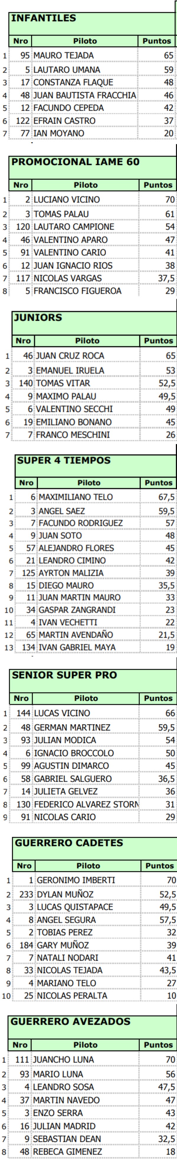 La fecha apertura del Karting Mendocino quedó atrás y ahora es tiempo de ver las estadísticas. Así marchan los tablas de campeonatos, que tienen como líderes a: