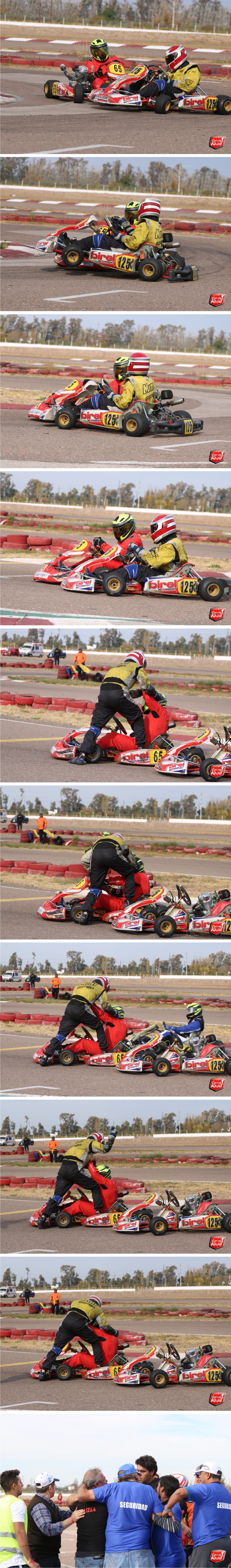 Martín Avendaño (kart 65) y Ayrton Malizia (kart 25) venían disputando una posición (lejos de la punta) y habían tenido varios roces en pista. Pero todo se desencadenó cuando en la famosa “curva de la discordia” Avendaño no hizo aparentemente una buena maniobra, impactó contra el kart de Ayrton Malizia y ambás máquinas se detuvieron.