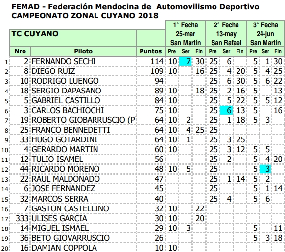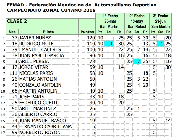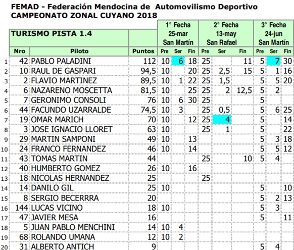 Luego del GP Vendimia 2018, te mostramos como marchan los campeonatos de las cuatro categorías que integran el Zonal Cuyano de Automovilismo.