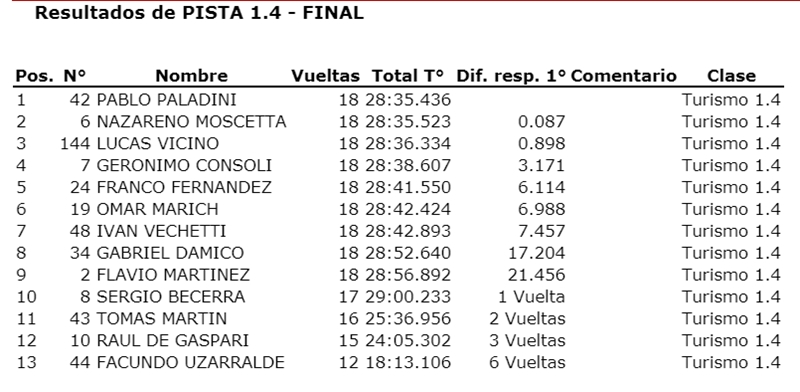 Cuarto llegó Alejandro Pavéz, quien estuvo liderando gran parte de la carrera, luego de que Sette y Martínez tuvieron un toque entre sí en las vueltas iniciales de la carrera.