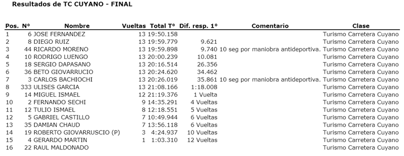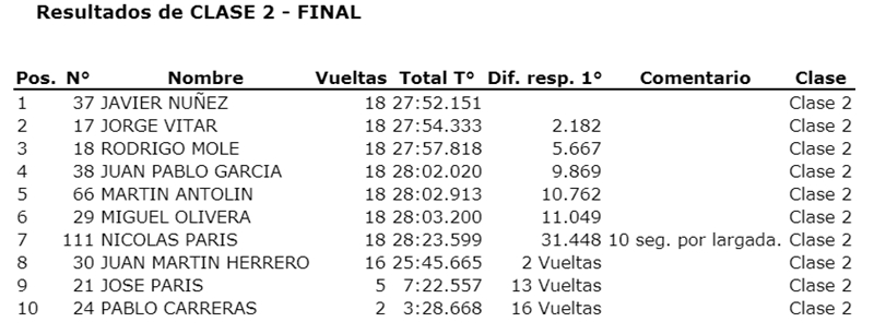 El podio se demoró una eternidad. Los comisarios deportivos declararon como ganador a Fernández, segundo Ruiz y tercero Moreno, recargado por un toque. Se hizo el podio casi dos horas después de finalizada la actividad, pero más tarde continuaron las novedades.