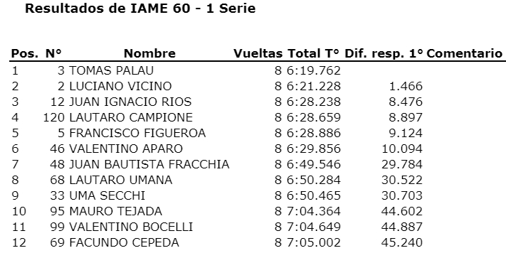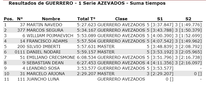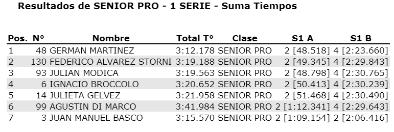 El actual monarca Gerónimo Imberti comenzó ganando la primera serie, que en pista fue para Tobías Pérez, pero al recibir un puesto de recargo, la primera posicón quedó para Imberti. Tercero se ubicó el debutante Facundo Gutierrez que reside en el distrito El Ñango, de San Martín. Para destacar el trabajo de Natalí Nodari que se mantuvo segunda hasta la mitad de la carrera.