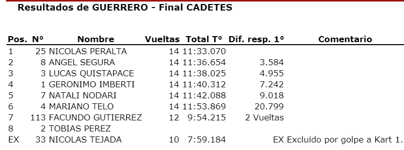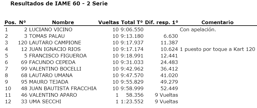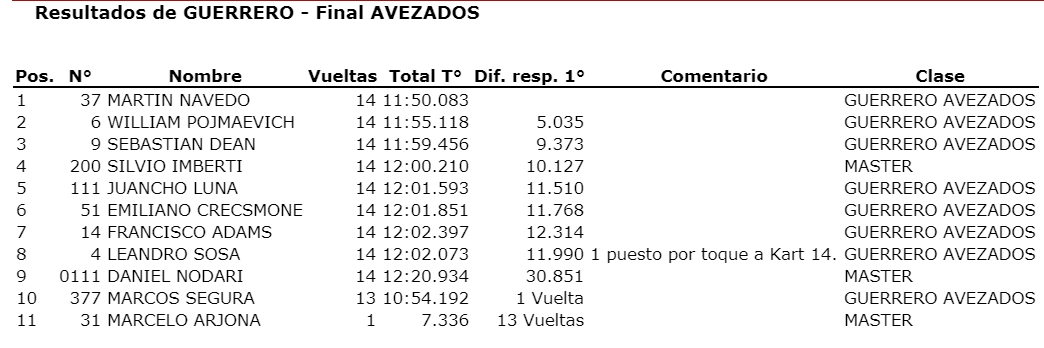 Pero lo más entretendido estuvo detrás, con una “batalla sin cuartel” entre un grupo de pilotos donde hubo roce, “chapa chapa”, siempre sin mala intención y donde se llevaron todas las miradas y aplausos, porque fue la mejor carrera final de la jornada. En el inicio Navedo pudo escaparse y dejó que Sebastián Dean se ocupará de tapar al racimo de karts que buscaban llegar al podio. Entre tanta lucha, Willy Pojmaevich dio el zarpaso se metió tercero y pudo escaparse en las últimas vueltas. Con el abandonó de segura, confirmó su segundo puesto.