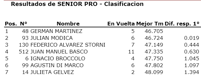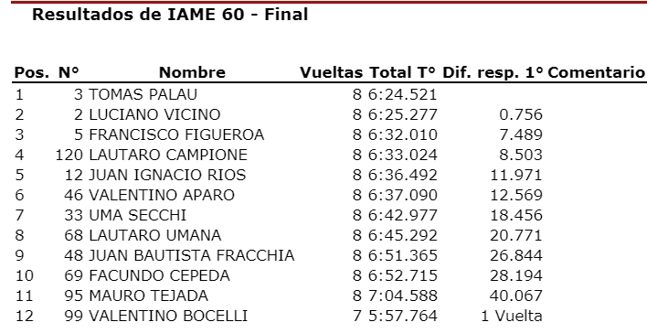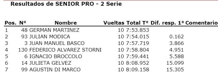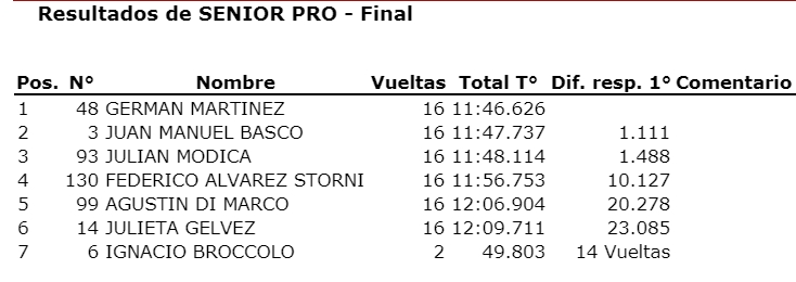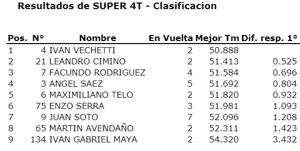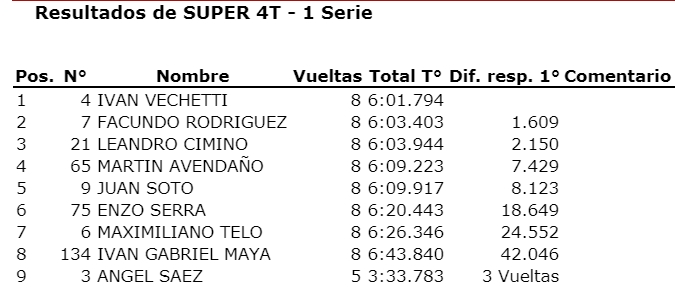 “Pety” de Coquimbito se tomó revancha de la carrera pasada donde no pudo sumar y ahora sumó bien par ael campeonato. Otro que sumó fue Julián Módica que fue tercero en la final y aprovechó a escaparse un poco en el campeonato teniendo en cuenta que el escolta Lucas Vicino estuvo ausente por estar compitiendo en Misiones con la Fórmula Renault 2.0.