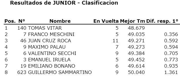 Con Vitar cortado adelante, lo más entretenido de la final fue la lucha entre Valentino Secchi y Emanuel Iruela. Ambos se pasaron un par de veces con maniobras exquisitas. Era escolta Iruela, pero en la última vuelta, Secchi se tiró en la “nueva curva” del circuito 3, para meterse segundo en el podio. Iruela llegó tercero, pero no pasó la técnica y el tercer puesto quedó para Franco Meschini (no figura reflejado en la planilla).