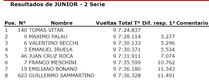 La tercera posición fue para Francisco Figueroa, quien logró así su primer podio en la divisional. Cuarto fue Lautaro Campione y quinto “Nacho” Ríos, que en una de las series tuvo un fuerte golpe, pero se recuperó muy bien.