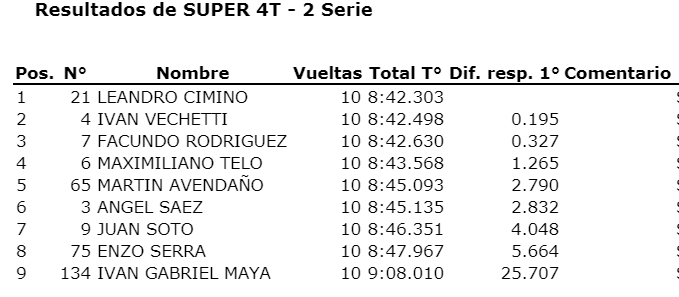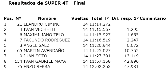 La final comenzó también siendo un calco de esta última serie. Cimino adelante, Vechetti y Rodriguez detrás, a lo que se sumó Maxi Telo. Maniobras al límite se vieron y varios sobrepasos. En un momento, Rodríguez superó a Cimino en la curva del hongo, pero salió un poco lento y Leandro se recuperó.