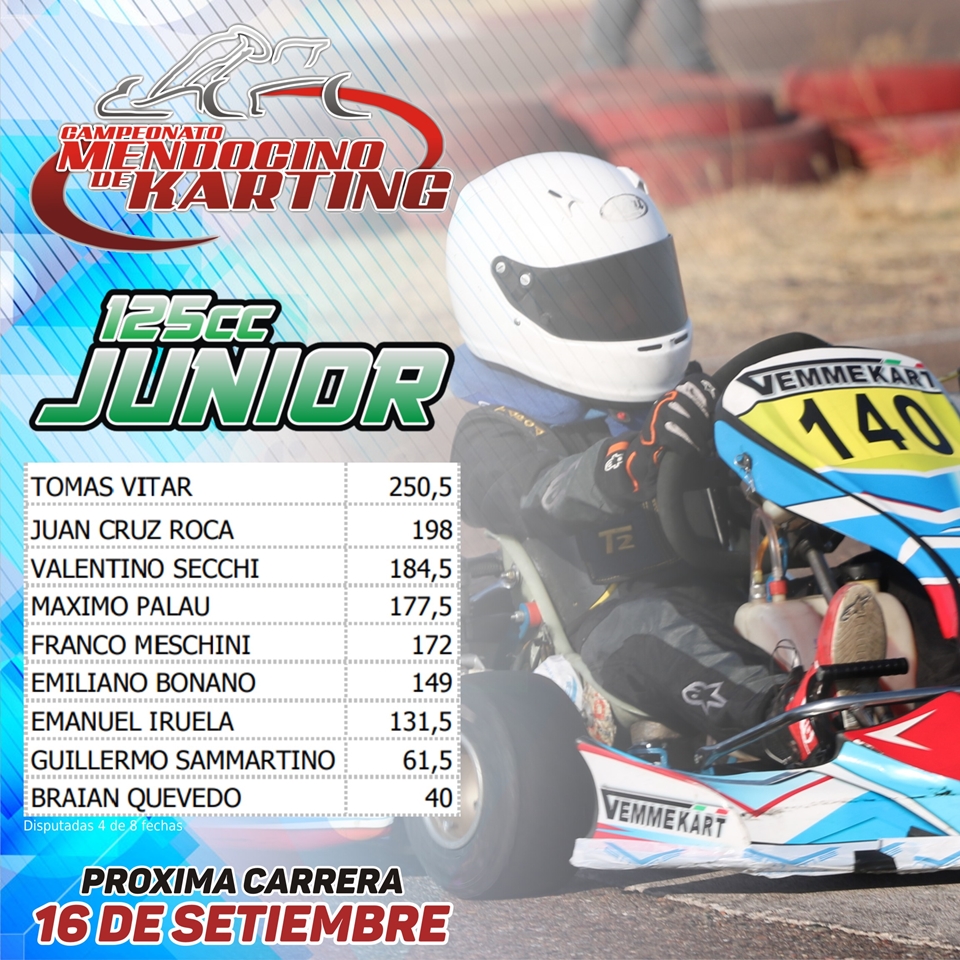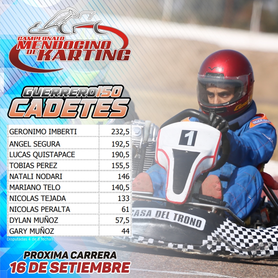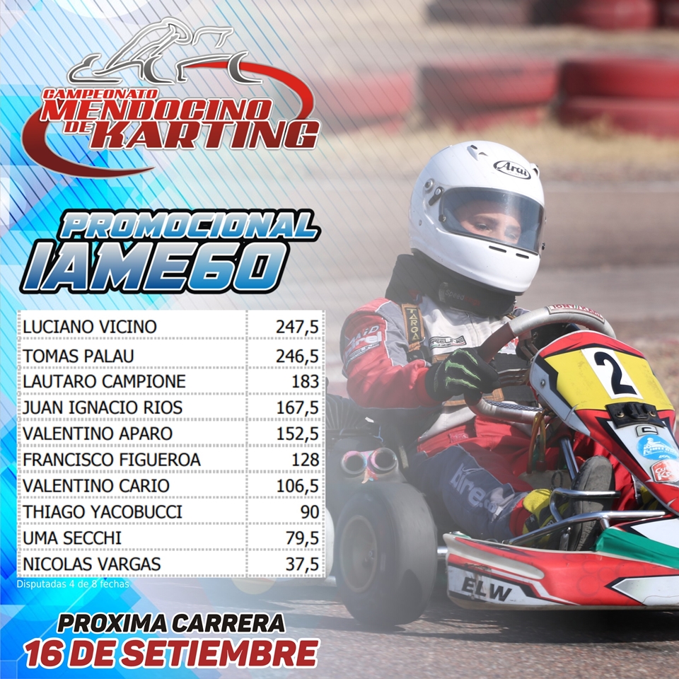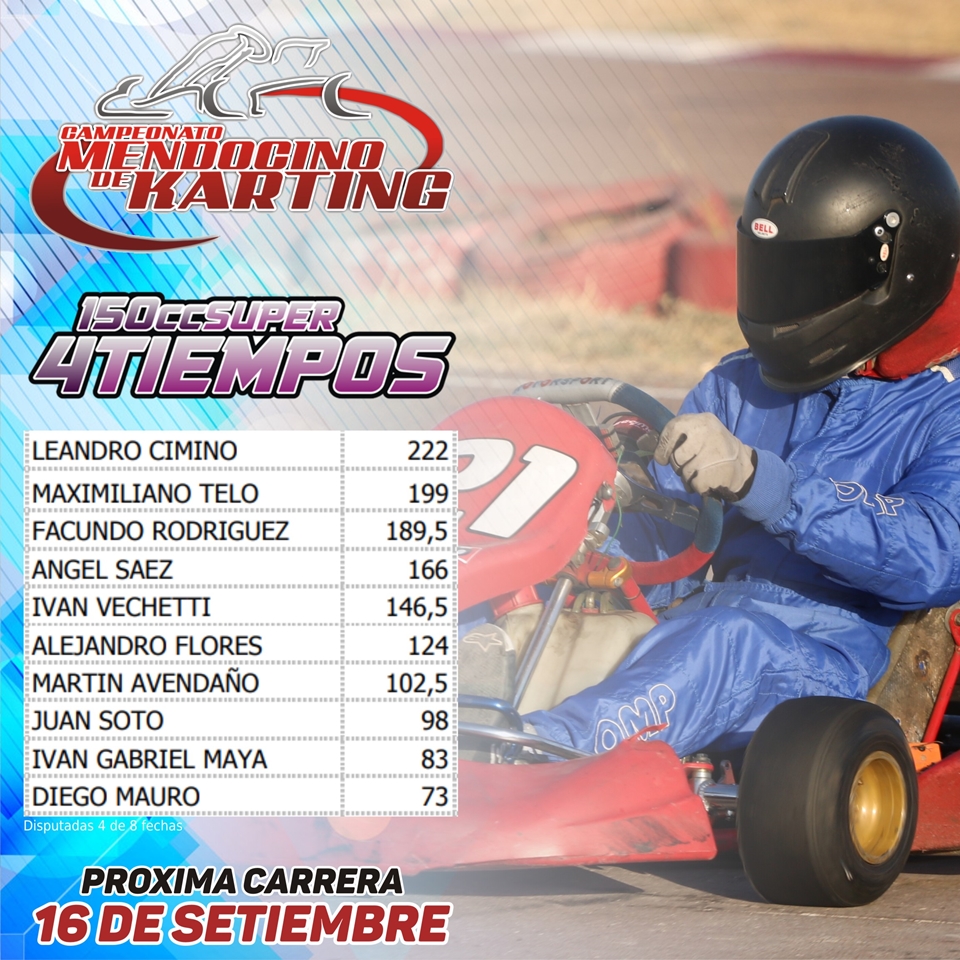 La cuarta fecha de la temporada será el domingo 16 de setiembre y se pondrá en juego el “Gran Premio Aniversario” del Kartódromo de San Martín, usando la variante número 1 (circuito corto).