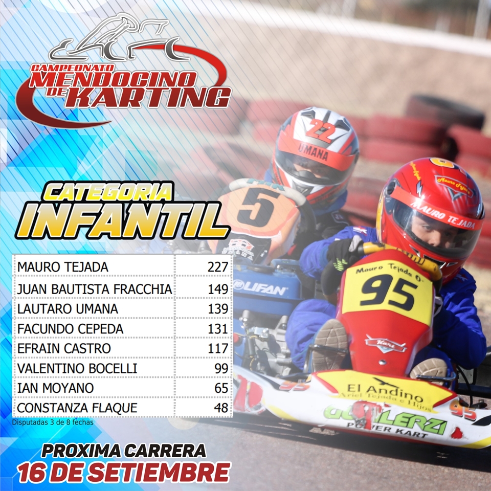 La divisional Infantil (7 a 9 años con motores 160cc 4 tiempos) está en alto riesgo de desaparecer, ya que en la anterior fecha no hubo pilotos inscriptos y varios de los integrantes se pasaron a la Promocional Iame 60. Si en la 5º fecha no se llega al mínimo de karts, la categoría quedará desierta y fuera del campeonato 2018.