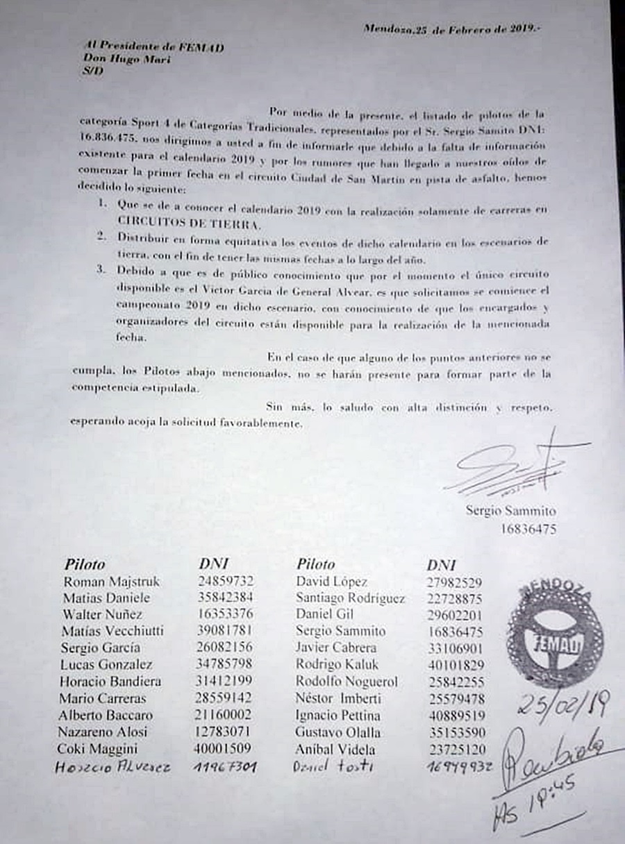 Los pilotos del Sport 4 enviaron una nota a FEMAD pidiendo que el calendario sea “únicamente” en pistas de tierras, como también ofreciendo el circuito de General Alvear para realizar la primera fecha de 2019.