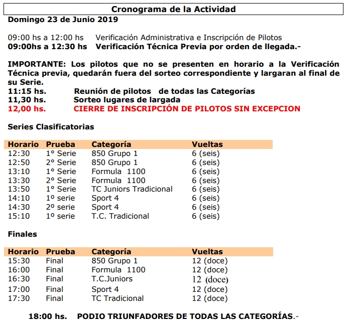 Los campeonatos son liderado por Diego Kubitz (850), Jorge de la Reta (F1100), Anibal Videla (TC Junior), Miguel Olivera (Sport 4) y Fabián Maggini (TC Tradicional).