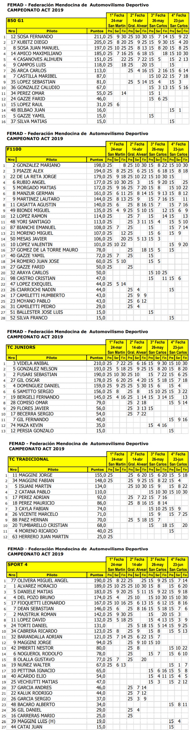 Son líderes el sanmartiniano FERNANDO SOSA en 850 y el guaymallino MARIANO GONZALEZ en la Fórmula 1100. El rivadaviense ANIBAL VIDELA es único puntero en TC Junior, mientras que el tupungatino Jorge Maggini manda en las cupecitas del TC Tradicional. El alvearense MIGUEL OLIVERA es quien más puntos tiene en el competitivo Sport 4.