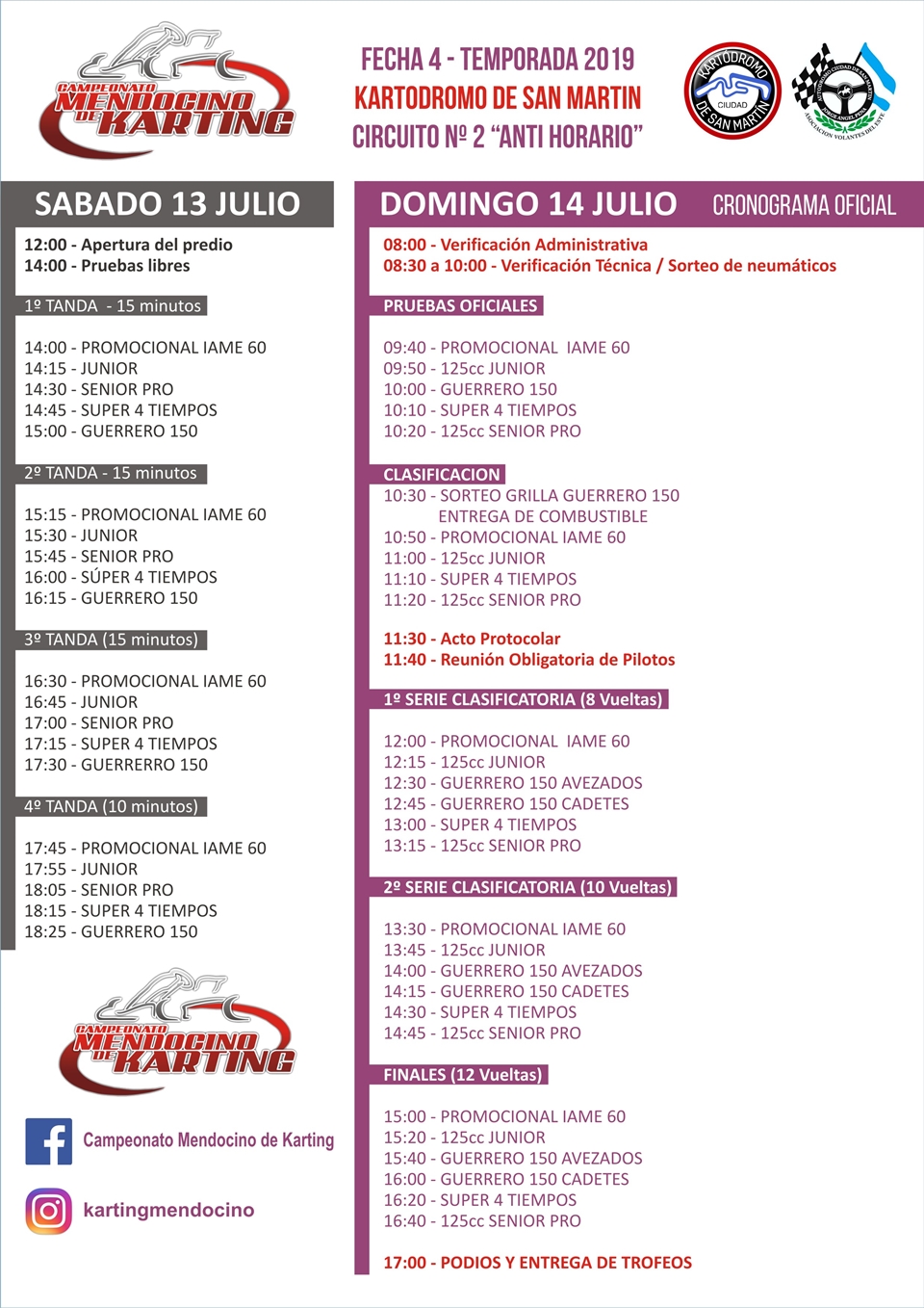 El sábado habrá prácticas libres desde las 14 horas, organizadas por categoría. El domingo va toda la actividad oficial desde las 9:40. Clasificarán a las 10:30 y desde las 12 horas se podrán disfrutar de 12 series. A partir de las 15 se correrán las 6 finales, para concluir la jornada con la premiación.