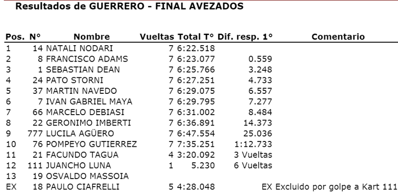 La mayor tarea fue en la segunda serie, donde llegó a estar sexta, pero Natalí nunca se desesperó. Aprovechó algunos toques para avanzar, hasta que en un maniobra impecable en la curva del norte, pasó al frente para ganar. La final fue de principio a fin para ella, donde no se puso ni nerviosa con el avance del chileno Francisco Adams, que sobre el ocaso de la carrera se acercó mucho a la punta.