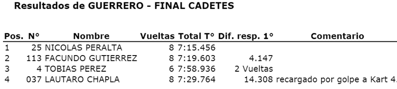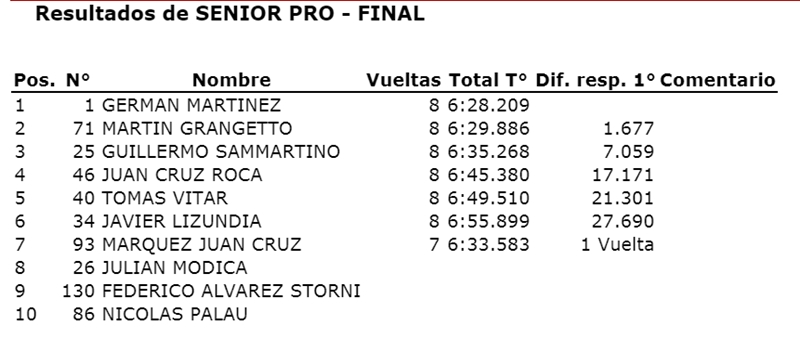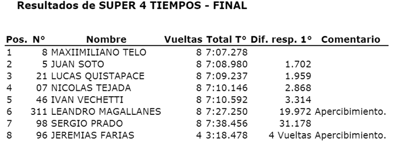 Nicolás Peralta venció en la final y sumó su tercera victoria. Fue acompañado en el podio por Gutierrez y Pérez, mientras que Chapla que terminó tercero en pista, sufrió un recargo y quedó cuarto.