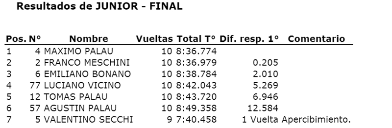 Excelente y entretenida carrera brindó la Junior, con una paridad notable tanto en la potencia de los karts como en el manejo de los pilotos. La segunda serie y, principalmente la final, fueron dignas de aplaudir por el público presente.