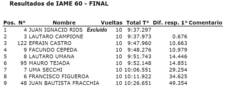 Lautaro Campione consiguió su primera victoria dentro de la categoría Promocional, luego de terminar segundo en la carrera final y acceder a lo más alto del podio luego de la exclusión por técnica de Juan Ignacio Ríos (problemas en el embrague).