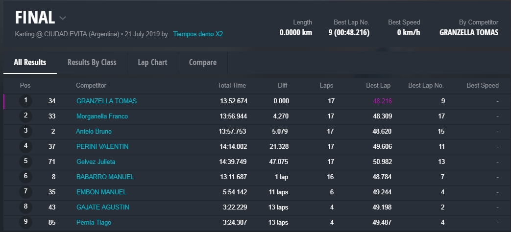 “No nos fue como esperábamos, pero terminamos la carrera, aunque con una goma trasera desinflada. Evita me ha molido porque es un circuito trabado y me costó mucho poner a punto el chasis” explicó Gelvez.