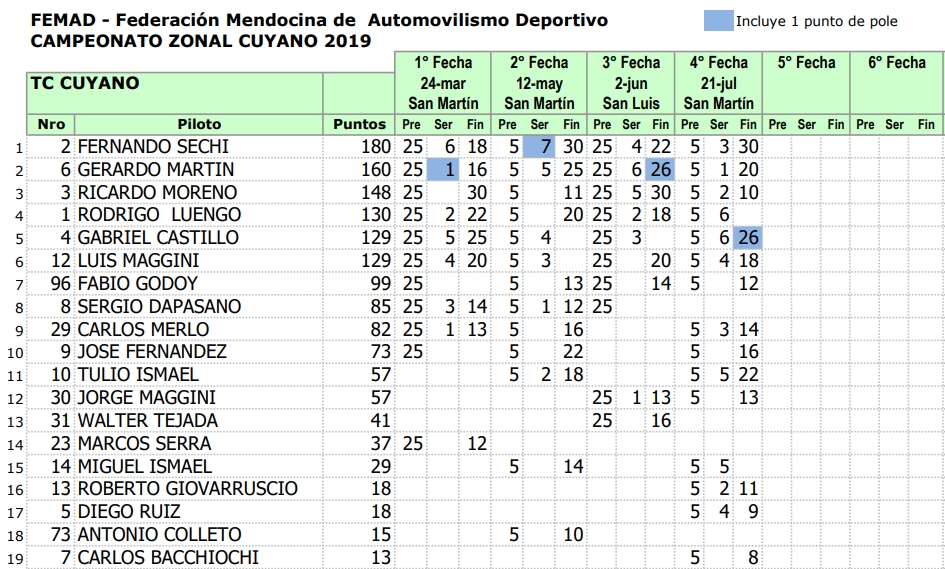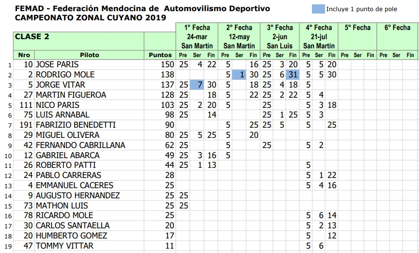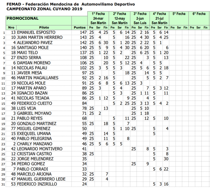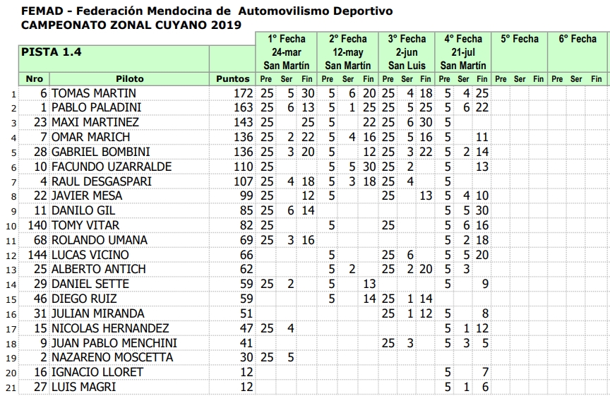 Luego del GP Vendimia realizado en San Martín y cumplidas 4 fechas de 8 programadas, los campeonatos del Zonal Cuyano son liderados por: