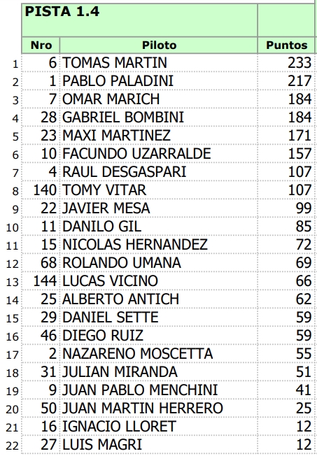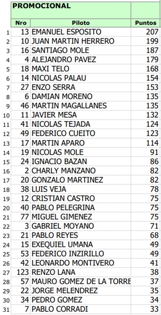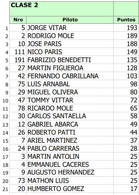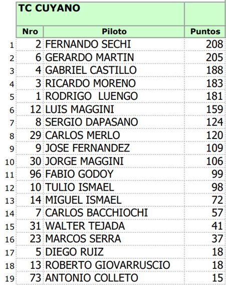 Luego de disputadas 5 carreras del Zonal Cuyano, los líderes son Fernando Secchi (TC Cuyano), Emmanuel Espósito (Turismo Promocional), Jorge Vitar (Clase 2) y Tomás Martin (Turismo Pista 1.4).