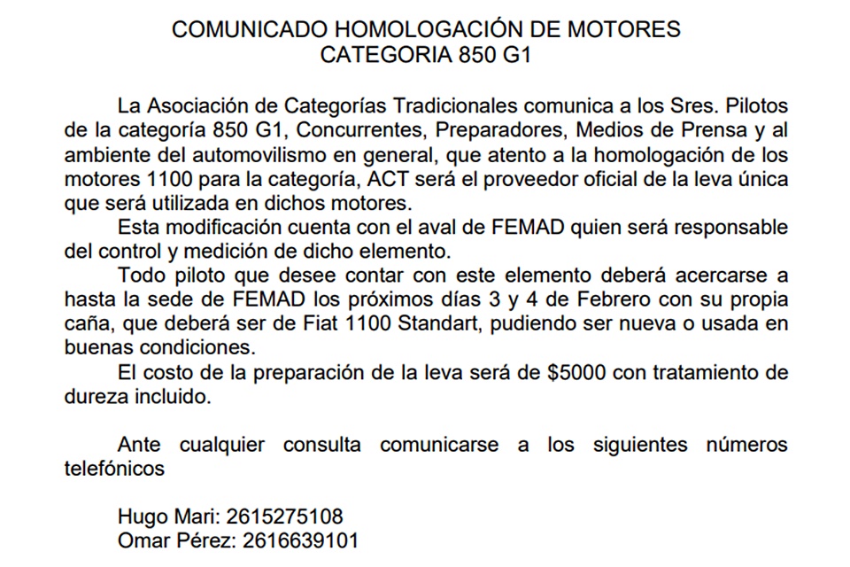 Hoy FEMAD publicó un comunicado confirmando que se homologarán los motores 1100 para esta divisional y que ACT será el proveedor de la leva única que será utilizada en estos motores. FEMAD controlará y medirá este elemento.