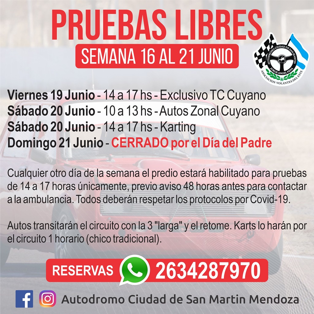 Todos los pilotos deberán abonar el valor de la prueba, seguro médico y costo de ambulancia, este último a distribuir entre todos los presentes durante el día. Máximo 3 personas por vehículo (piloto y 2 acompañantes). Turnos de 3 horas. Usar tapabocas y medidas sanitarias.