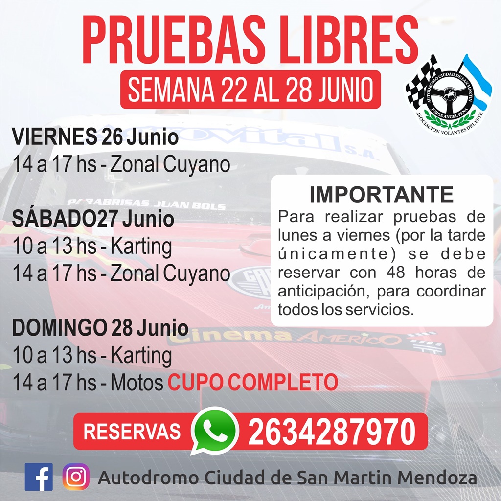 AVE informó el calendario de pruebas libres correspondiente para esta semana en el Autódromo y Kartódromo de San Martín.