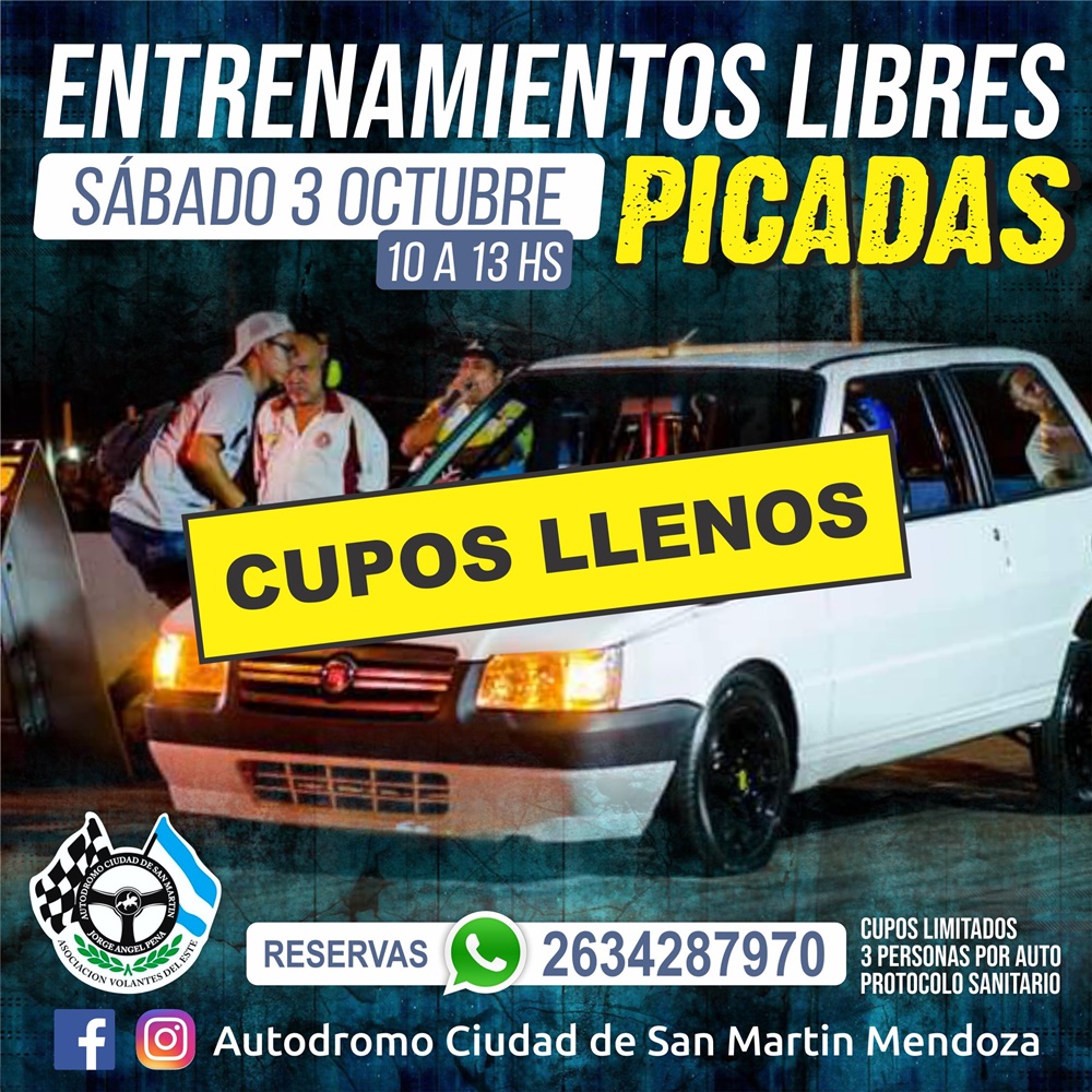 Desde este fin de semana incorporamos pruebas libres de PICADAS en forma individual (tiradas de 1 solo auto) y continuamos con las prácticas de KARTING, ZONAL Y MOTOS.