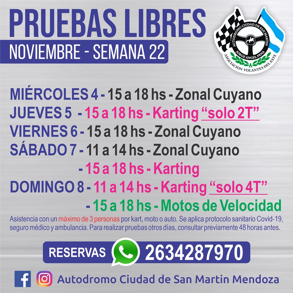 Días y horarios de pruebas para prácticas en el Pena 03/11/2020 / Zonal Cuyano Cronograma de prácticas para la #Semana22 en el Autódromo Ciudad de San Martín.