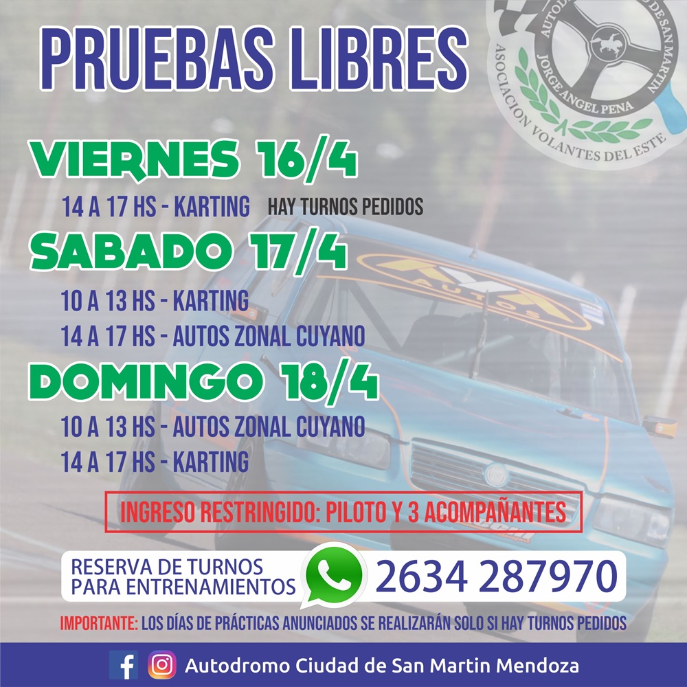 AVE informa el cronograma de pruebas libres para el próximo fin de semana en el Autódromo y Kartódromo de San Martín, con cambios de horarios debido a la estación del año que estamos transcurriendo.