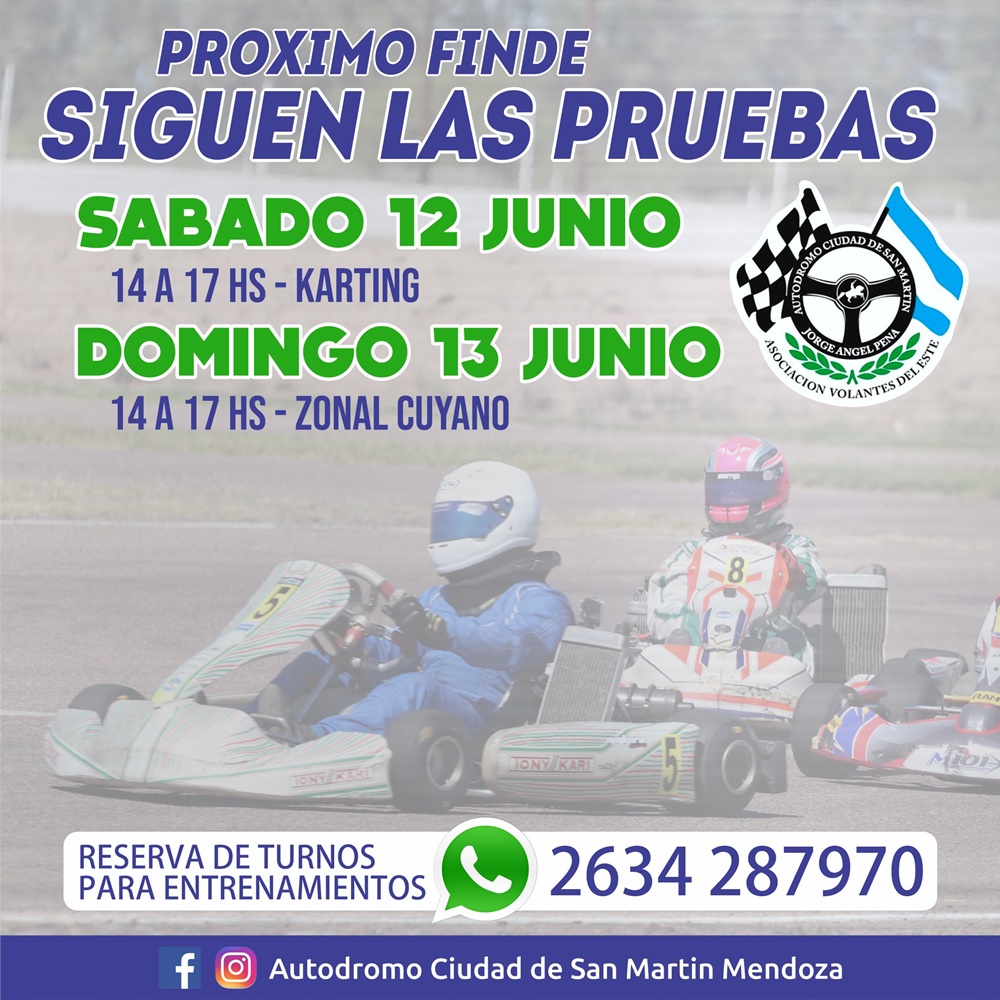 Desde la Asociación Volantes del Este (AVE) se confirma que continúan las pruebas libres pero en forma reducida. Solo habrá un turno por fin de semana para el Zonal Cuyano y un turno para Karting, en horario de tarde. Por el momento, se programarán entrenamientos de lunes a viernes.