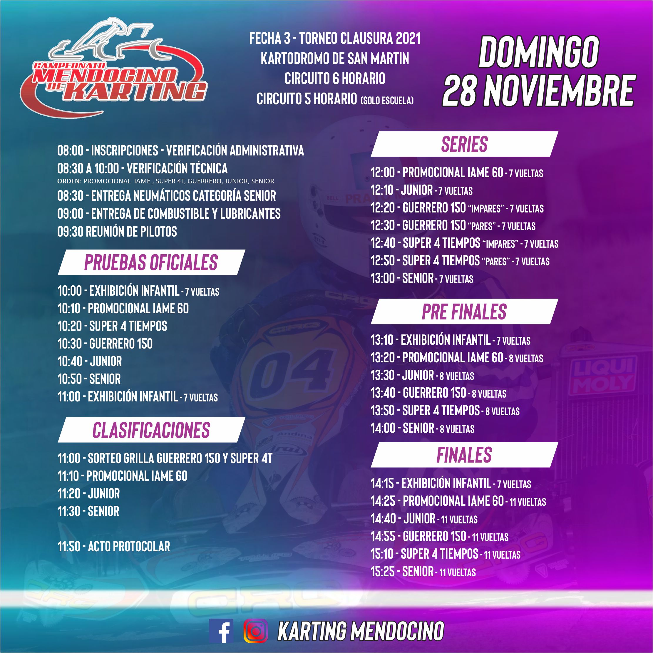 Este VIERNES se podrán realizar pruebas libres desde las 15 horas en el Kartódromo de San Martín y el SÁBADO la actividad inicia a las 14 horas donde habrán 4 tandas de prácticas por categoría.