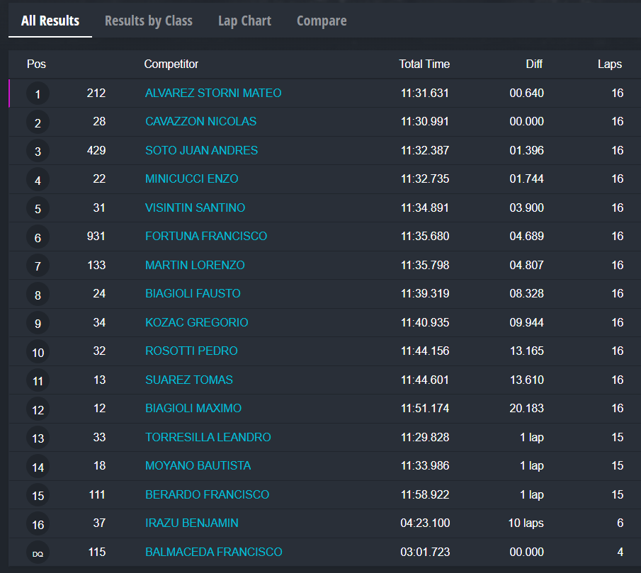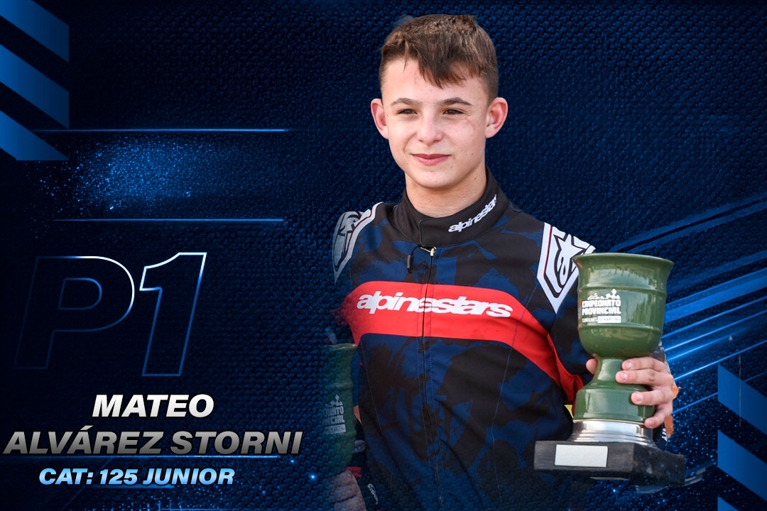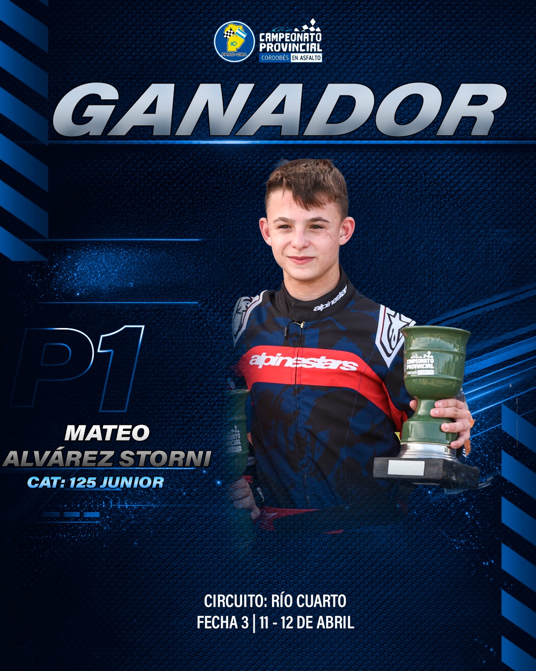 En la categoría 125 Junior fue triunfo de MATEO ALVAREZ STORNI, el sanmartiniano que venía de hacer podio en Rotax, ahora ganó en Córdoba. Clasificó 7° entre 17, creció hasta el 4° lugar en la serie y quedó como ganador de la final junto con el récord de vuelta.