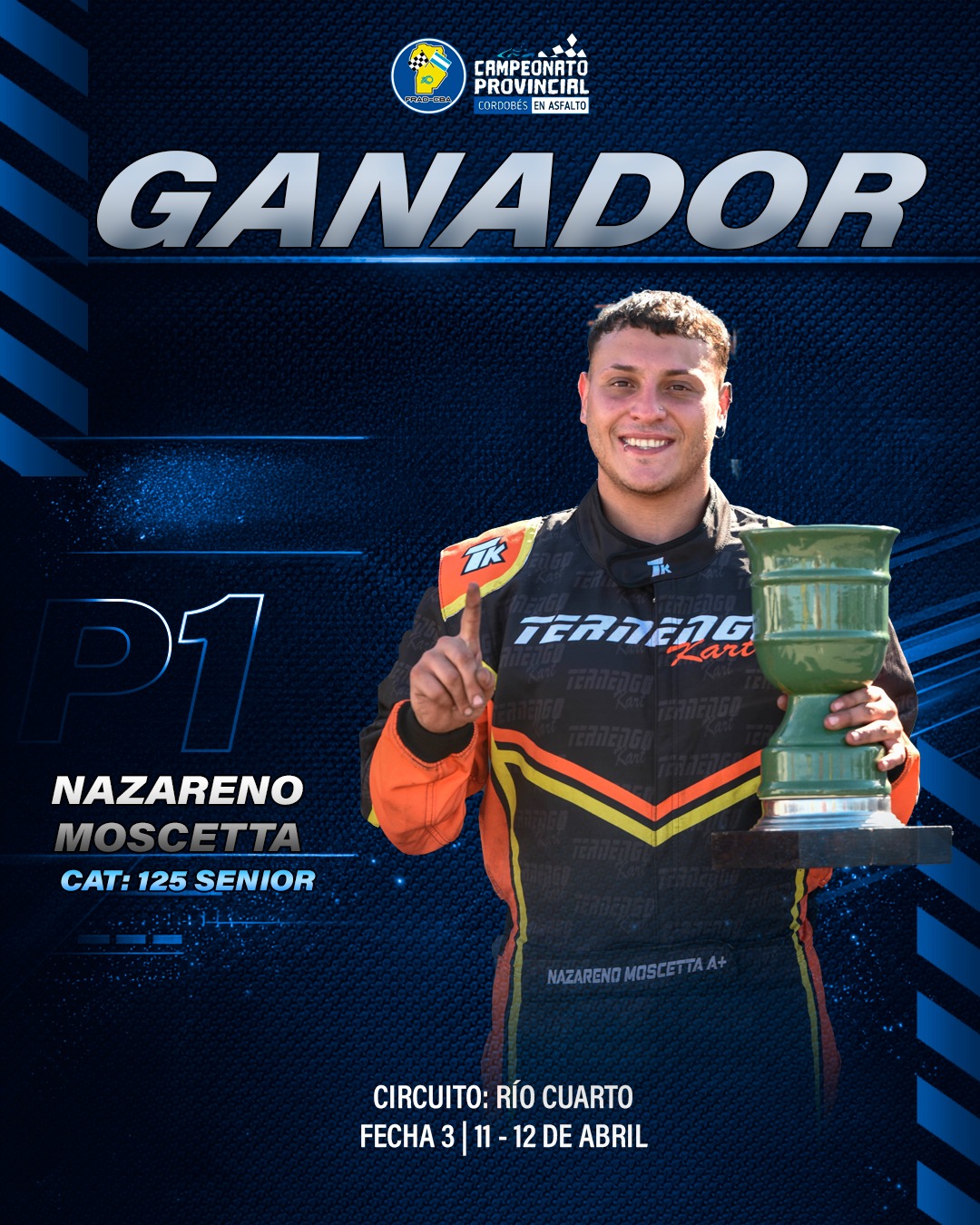 En la categoría más veloz 125 Senior el triunfo fue para NAZARENO MOSCETTA que habia clasificado 8° y avanzado hasta el 2° lugar en la única serie. Partió en primera fila la carrera definitiva donde festejó su primera victoria del 2026.
